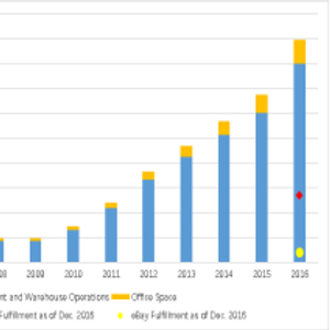2.亚马逊专注于投资其仓储和配送中心(FBA),对其他第三方销售服务提供商造成了一个高的进入壁垒。(图表1)在2006年推出的100多个仓储物流中心不仅加速了订单的完成,而且还具备剔除不合格的卖家的作用。自成立以来,FBA已经显著改善了客户服务,使第三方销售收入从0%增长到17%,并将主营业务成本占收入比重从77%降低到59%。相比之下,其他在线零售商无法在规模上与亚马逊进行竞争,因此股价下跌。亚马逊还开发了仓库机器人解决方案,让人类和机器人都能专注于自己擅长的任务,将一些单一枯燥的工作分配给机器人,比如挑选和运送。因此,仓库效率不断提高,在不增加人员的情况下,订单量高达30%,及时配送率达到99.8%。