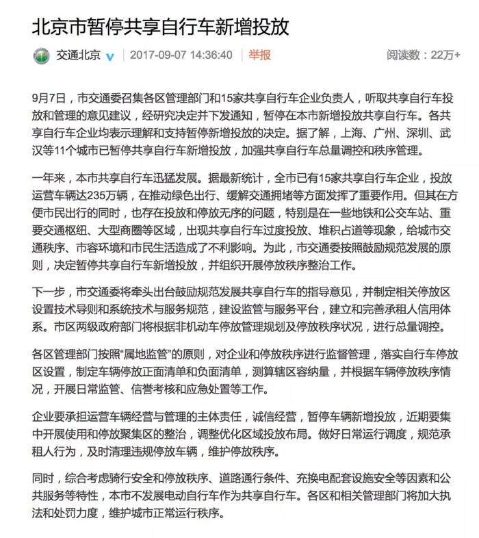 昨天(9月7日),北京市交通委召集各区管理部门和15家共享自行车企业负责人,听取共享自行车投放和管理的意见建议,经研究决定并下发通知,暂停在北京市新增投放共享自行车。