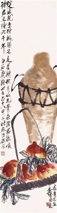 在日本的中国近现代书画拍卖市场上,吴昌硕、齐白石两位大师自然是绕不过去的。在此次拍卖会上,一件齐白石《琼浆寿桃图》立轴,成交价达到了7285.84万日元。白石老人自乡野而来,所绘题材最富生活气息。其自创寿酒题材,以桃寓寿,取酒谐音久,寓意“寿久”,颜色浓艳而不媚俗。酒壶与桃子拉开适当距离,寥寥数笔,看上去既单纯又丰富。其写出桃叶脉,充分描绘其薄而轻柔的质感同时,也表现出笔线本身的力度变化,将寿桃衬托得充满生机和喜庆。按本作上款人“志青”即冯汝玠(1873-1940),民国时曾任北京大学教授,精通金石、文字、目录学,活跃于京津文化界,与齐白石、张大千、于非闇等交往从密。见画上题“志青先生寿”,可知白石老人曾将此画作为寿礼相赠,以祝其福寿绵长。