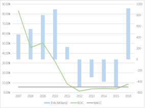 3.投资FBA和AWS是一有助于经济价值增加(EVA)的活动。可以观察到,亚马逊经历了FBA和AWS大量投资所导致的4个负EVA财政年度。然而,资本回报率(ROIC)在2016年终于有所回升,这得益于AWS部门的税后净营业利润(NOPAT)的改进。(表9)从长远来看,来自第三方和在线零售部门的税后净营业利润(NOPAT)也将得到改善。