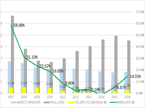 2.净资产收益率率(ROE)将会恢复。亚马逊的净资产收益率从2007年的58.48%下降到2014年的- 1.27%。主要原因是下降的财务杠杆率(股票乘数)和利润率(EBIT / Revenue)。尽管如此,由于市场了解FBA的短期影响以及对利润率的研究和开发投资,ROE的表现不佳并没有给股票价格带来多大压力。2016年,ROE上升到14.55%,主要由AWS驱动。展望未来,由于全食公司的收购,短期ROE预计将会下降,但长期ROE应该会上升。(表7、8)