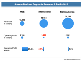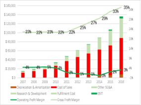 1.由于AWS和第三方销售服务的增长,预计运营利润率将会增加。AWS是亚马逊增长最快的业务部门,分别在2015年和2016年实现了70%和55%的年增长率。这一快速增长的部分,其利润率相对较高,使亚马逊的整体盈利能力得到提升。举例说明,2016年,AWS的营业利润率为25.4%,而其他部门则贡献了0.87%。同年,AWS产生了9%的合并收入和96.69%的综合营业收入。(表6)预计AWS将继续作为亚马逊的利润率资源管理器,尽管目前该部门的营运利润率较低,但随着投资逐渐放缓,规模经济对运营效率产生影响,预计其利润将会增长。