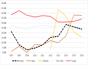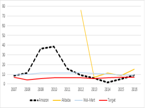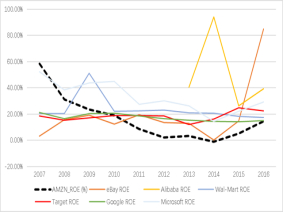 图表8:净资产收益率ROE比较,亚马逊VS同业