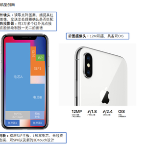 基于3D sensing革命性创新的FaceID:前置模块在“环境光传感器、距离传感器、前置摄像头”基础上加入红外镜头和点阵投影器:点阵投影器将3万多个红外光点投影在脸部绘制独一无二的面谱;红外镜头读取点阵图案、捕捉其红外图像,发送至处理器确认是否匹配。