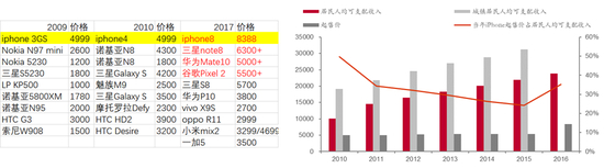 以目前主流旗舰机型为例,三星note8 国行定价预计6288-6988元,华为mate10预计定价也将接近6000,小米mix2定价3299-4699元,iPhone X 999美元的起售价(预计国行8388元起售)与2010年格局相比亦在相应范围内。同时我们从每年新iPhone起售价占当年居民人均可支配收入比例这一指标来看,今年iPhone X起售价与2016年居民人均可支配收入比值为35%,较2013-2015年有显著提升,但与2011、2012年水平基本相当。从这一角度来看,iPhone X定价水平与iPhone 4/4S基本相当。