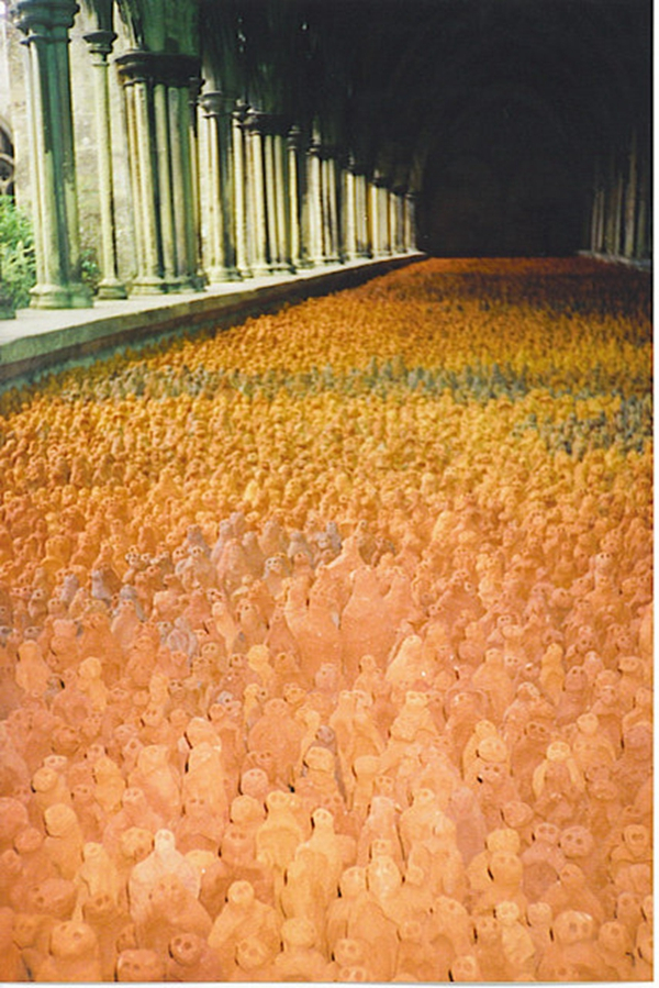 1991年,葛姆雷开启著名的“土地”系列。在墨西哥的乔卢拉城,他找了当地一个专门制造砖块的家族,请家族里60位成员共同制作出3500个陶俑小人。它们大小不一,其中最大的也不到30厘米高,造型简单粗糙,唯一可以辨别的只有头部和两个小坑所代表的眼睛。但是当成千的小陶俑密密麻麻地摆满整个展览空间时,没有人会不感到震颤,从而重新思考人类自身的存在。