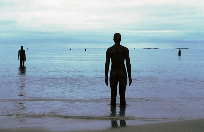 1997年,100个铁人被永久放置在英国克罗斯比海滩,它们有的半身陷入沙滩,有的立于礁石,凝望着大海。这件名为《别处》的大型装置作品,不断受到海水侵蚀,随着时间流逝,铸铁表面产生了坑坑洼洼的纹理变化。铁人数量众多,但是散布于大自然环境之中,反而显得孤立无助。