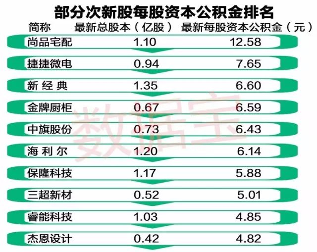 衡量高送转潜力的另一个重要指标是每股资本公积金,越高的送转潜力越大。榜单中,尚品宅配以12.58元的每股资本公积金位居首位;捷捷微电7.65元位居次席。此外,新经典、金牌厨柜、中旗股份、海利尔等个股最新每股资本公积金均超过6元。