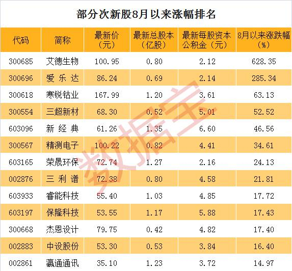 次新股+高送转概念又火爆起来!皮阿诺8月份以来暴涨近90%,杭州园林大涨55.83%,同兴达大涨41.67%……,9只次新+半年报高送转的股票,8月以来平均涨幅高达35.40%,中位数上涨30.11%。