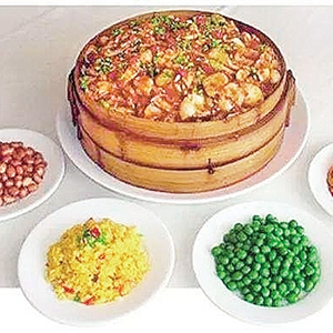 “四星望月”,是赣南客家的一道名菜,俗称“兴国粉笼床”。在当地,逢年过节、操办喜事和接待宾客的筵席上,此菜必不可缺,因为它寓意着“团团圆圆、合家幸福”。