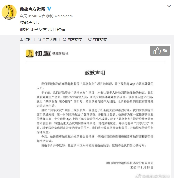 9月18日上午,在“共享女友”项目被罚款后,他趣今日发布声明称,将暂停“共享女友”项目的运营。