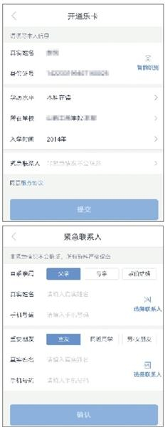 舒同告诉新京报记者,点击“开通乐卡”后,分期乐APP跳出了“我是学生”和“我已毕业”两个选项,选择“我是学生”后,需要填写姓名和身份证号、学校和学历信息、紧急联系人信息以及个人银行卡号。最后经过刷脸认证,获得了贷款额度8000元。