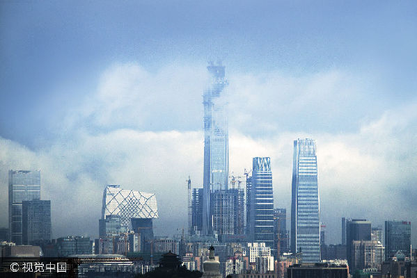 2017年6月23日,北京,一场大雨过后,穿梭在云层里的中国尊。