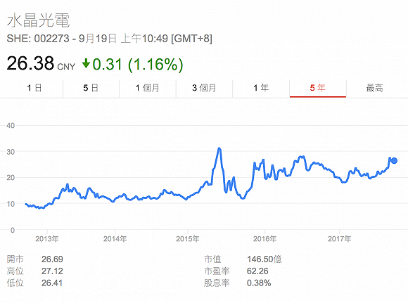 近几年来,随着智能手机拍照水平的提升,水晶光电的股价也水涨船高,在 2012 年时每股为 9.78 元,到了 2017 年 9 月份,每股股价已经达到了 27 元左右,公司市值为 146 亿元。