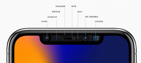 除却外观上的改变,iPhone X 最具争议的部分,莫过于屏幕中央的‘刘海’了。在这一小块区域里,iPhone X 集成了大量的传感器,借助红外镜头、泛光感应元件以及点阵投影仪的协同运作,从而让用户能够通过 Face ID 刷脸解锁。