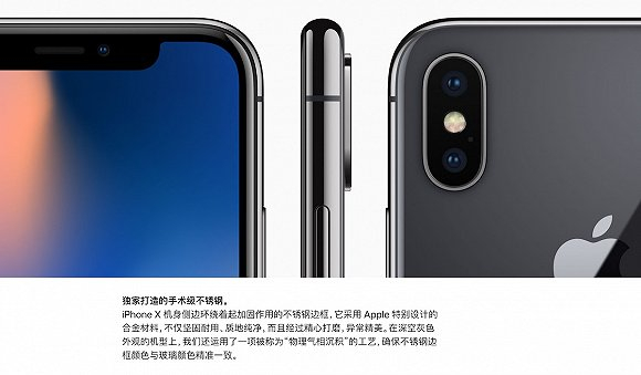 除了玻璃机身之外,不锈钢中框也是 iPhone X 外观上着重升级的部分,苹果官网将其形容为‘手术级不锈钢’。