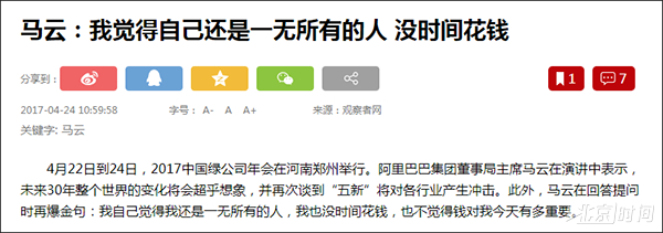 比如今年4月马云曾说,“我自己觉得我还是一无所有的人,我也没时间花钱,也不觉得钱对我今天有多重要。”