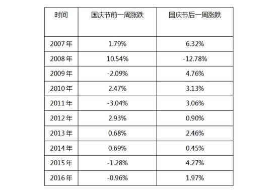 从统计来看,近十年来,在国庆长假前,沪指上涨6次,下跌4次。国庆长假后,沪指上涨的概率更大,10年中,9次上涨,仅1次下跌。
