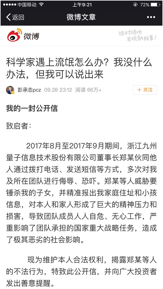 9月28日深夜,微博上的一篇《科学家遇上流氓怎么办?我没什么办法,但我可以说出来》的实名举报信,搅动了整个量子通信同行。