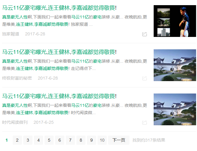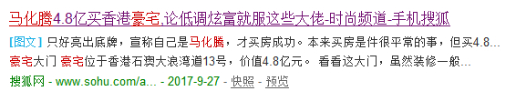 为此,环球网科技记者在搜索引擎中输入“马云11亿豪宅首次曝光,真是豪无人性! 连王健林,李嘉诚都觉得敬畏”发现,有317篇公众号文章在列,时间从今年6月一直到现在。记者还发现,不仅是马云,中国企业家如马化腾、刘强东等与“豪宅”作为关键词,也成为众多自媒体热捧的文章。