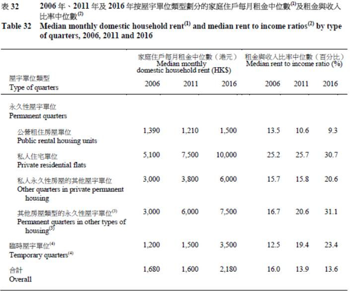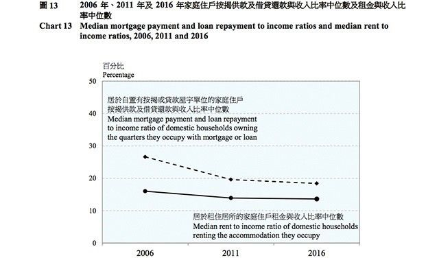 再细看的话,其中居于自置私人永久性房屋的住户每月付款的中位数及相对收入比率的中位数分别为10,500港元及19%。而在2011年,这两个指标分别是8,000港元及20%。