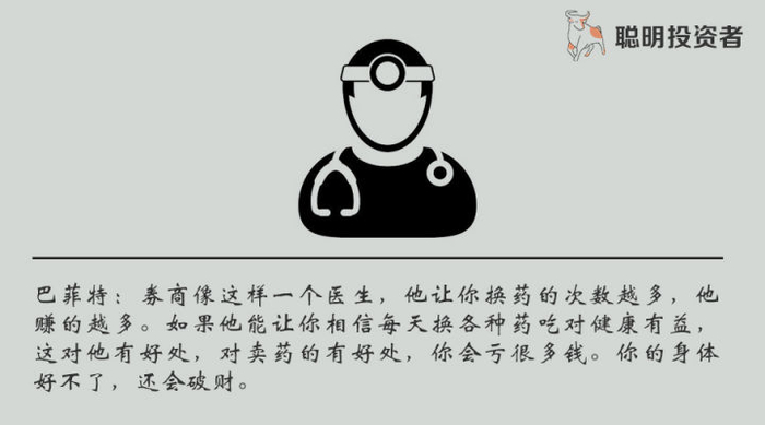 券商像这样一个医生,他让你换药的次数越多,他赚的越多。他要是给你一种药,把你的病根治了,他只能做成一笔买卖,一笔交易,然后就没了。如果他能让你相信每天换各种药吃对健康有益,这对他有好处,对卖药的有好处,你会亏很多钱。你的身体好不了,还会破财。
