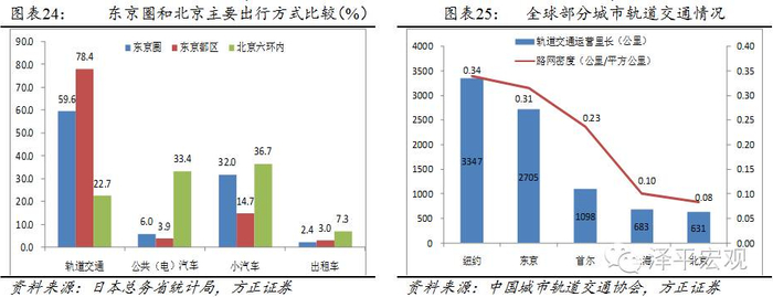此外,东京圈民用汽车(包括载货汽车)数为1413万辆,远高于北京的535万辆、上海的282万辆。但东京圈小汽车出行比例相对较低,为32.0%,特别是在东京都区,仅为14.7%,明显低于北京六环内的36.7%。东京圈没有通过购车摇号、单双号限行等行政手段限制汽车购买和使用,而是通过大力发展轨道交通、并在核心区域收取高额停车费来降低汽车使用。
