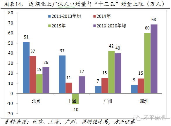 与此同时,广州、深圳的常住人口增量大幅增长。广州市常住人口增量从2011-2013年的年均7.2万人增至2014年的15.4万人,再增至2015年的42.1万人;深圳市常住人口增量从2011-2013年的年均8.6万人增至2014年的15.0万人,再增至2015年的60.0万人。其中原因除广州、深圳自身的经济增长速度相对较快外,可能还在于北京、上海人口调控“赶人”的影响。