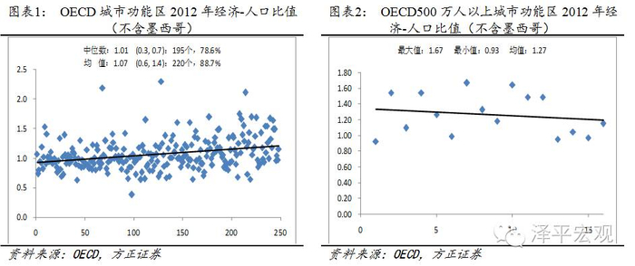 剔除新兴经济体墨西哥的数据,2012年OECD248个城市功能区的经济-人口比值的中位数为1.01,均值为1.07;其中,有195个城市功能区的经济-人口比值处于(0.7, 1.3)之间,占比为78.6%;有220个城市功能区的经济-人口比值处于(0.6, 1.4)之间,占比为88.7%。在500万人以上的城市功能区中,经济-人口比值最大为1.67,最小为0.93,均值为1.27。