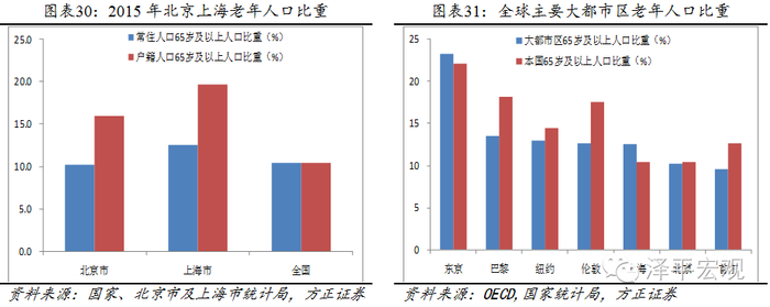 北京上海人口发展存在的突出问题:老龄化、人口分布、职住分离。1)老龄化。2015年北京、上海户籍人口60岁及以上人口占比分别高达23.6%、30.2%,大量年轻外来人口涌入使得两地常住人口老龄化程度大幅下降,其中北京市接近全国平均水平、上海市明显高于全国平均水平。从全球角度看,国际大都市区的老年人口比重多明显低于本国平均水平。2)人口分布。北京市五环内、上海市外环内均集聚了接近一半的常住人口,人口密度分别高达15774、17056人/平方公里,接近首尔市的15807人/平方公里(高峰曾达17500人/平方公里),明显高于东京都区的14525人/平方公里。这意味着北京市、上海市的核心区域人口已经严重饱和。3)职住分离。北京市地铁早晚高峰进出站客流量分布数据表明,北京市的就业分布相对集中,而居住分布比较分散,且二者相距较远。一些地区“睡城效应”十分明显,比如北京回龙观-天通苑地区。