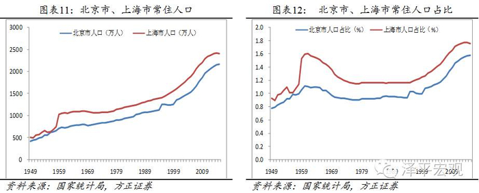 1949年以来,北京市、上海市常住人口基本保持持续快速增长。北京市常住人口从1949年的420万人增至2015年的2171万人,占全国比例从0.78%增至1.58%;上海市常住人口从503万人快速增至2415万人,占全国比例从0.93%增至1.76%。