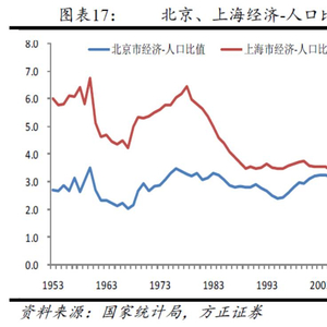 从经济-人口分布的角度看,北京市的经济-人口比值呈波动式变化,但在2004年达3.73的阶段性峰值后基本呈下降趋势,2015年为2.15;上海市呈波动式下降,特别是1978年达6.47的阶段性峰值后呈明显下降趋势,2015年为2.10。即便考虑居住在区外、工作在区内的人口,单纯对北京市、上海市常住人口各加200万,北京市、上海市的经济-人口比值依然高达1.9以上。