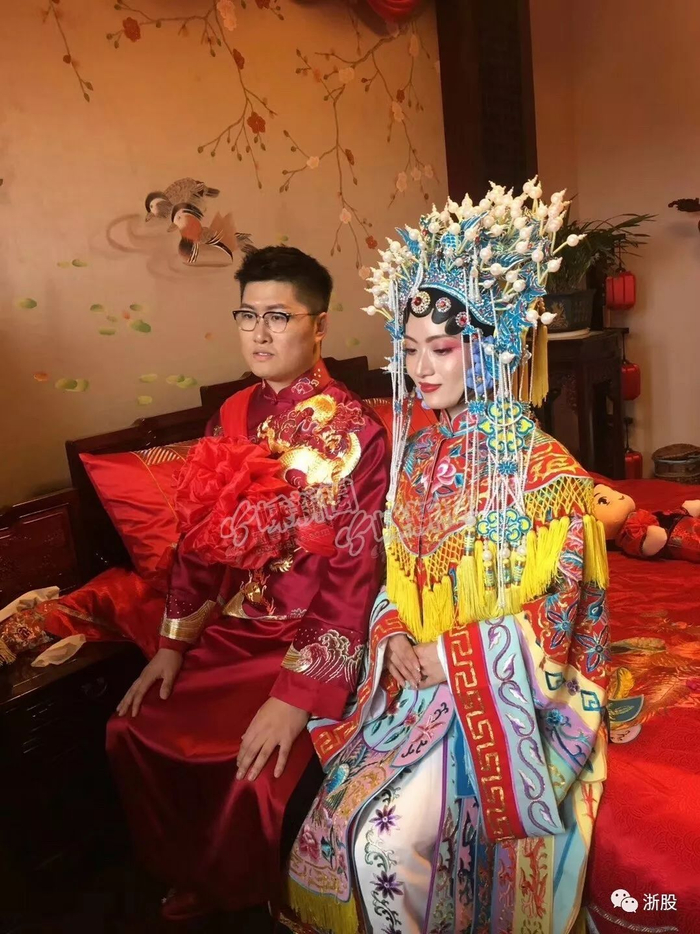 新郎官吴锦华是英国海归,高大帅气;新娘沈佳妮凤冠霞帔,貌美如花。