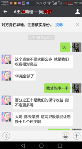 李先生向新浪财经展示了该公司业务人员吴某承诺的“保守收益50%”截图: