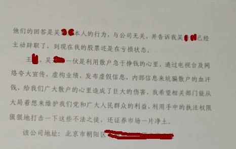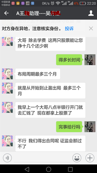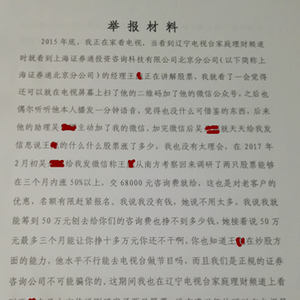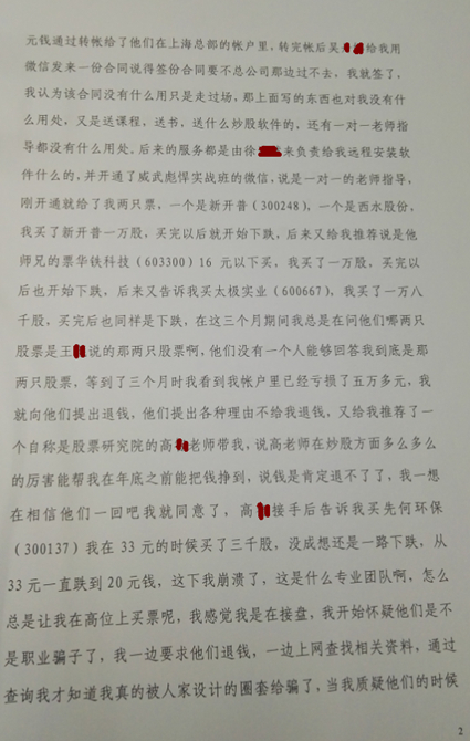李先生向新浪财经表示,2015年底,我在辽宁电视台家庭理财频道看到上海证券通投资资讯科技有限公司北京分公司的经理王某讲解股票,后扫描屏幕二维码加了微信公众号,王某助理吴某加我微信,在2017年2月初吴某给我发微信称王某从南方考察回来调研了两只股票能够在三个月内涨50%以上,交68000元咨询费就给股票,随后和王某证实吴某是其助理,并视频确认。2017年2月15日我妻子到浦发银行用她的浦发银行卡将68000元钱转账给他们上海总部的账户,并签署合同。随后给我荐股新开普(买1万股),买后即下跌,后又买入其推荐华铁科技、太极实业,等到三个月时发现账户亏损5万多,后提出退钱,对方表示不能退,随后接受对方荐股先河环保,买入时33元,一直跌到20元,亏损39.3%,当我质疑他们的时候,他们回答称是吴某本人行为与公司无关,并告知吴某已主动辞职。
