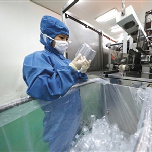 9月13日,江西抚州,江西回音必(东亚)药业有限公司内,塑瓶输液生产线上工人正在生产。图/视觉中国