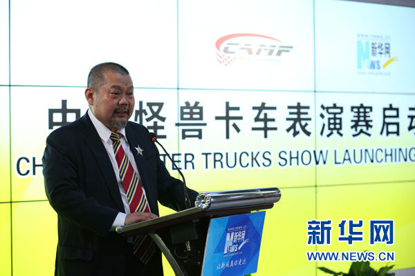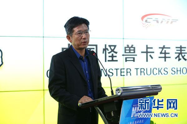 10月11日,2017中国怪兽卡车表演赛启动仪式新闻发布会在京举行。图为国家体育总局汽车摩托车运动管理中心主任、中国汽车摩托车运动联合会主席詹郭军致辞。新华网 陈延特 摄