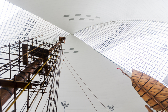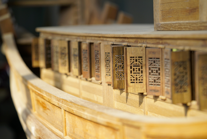 岑国和有一条底线,仿古船要复古如旧,至少在外观上要与史料典籍所记载的有80%相似。仿明代福船是他认为与实物相似度最高的作品。中国航海博物馆文物管理部主任王军,全程参与了当年的复原设计。他提到,福船作为郑和下西洋船队中最具代表性的船型,前期设计参考了南京龙江宝船厂遗址的文献资料、出土文物和泉州湾后渚港发掘的宋代沉船及出土物等诸多历史依据,并结合了相关专家、学者论证,最后由岑氏木船作坊进行建造。大到所用木料,小到一盏灯笼,都尽可能做到与史料统一。