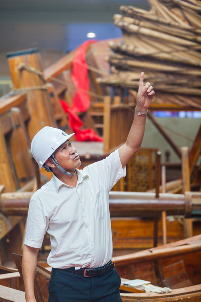 国庆前他没得闲,带队在上海中国航海博物馆修复30米长的仿明代福船。但博物馆的仿明代福船虽能远航,却从未下海,岑国和一直惋惜。三周后的那个验收日,10月10日,他脱下蓝色工作服,穿回白衬衣,独自与这艘8年前亲手打造的大船告别。