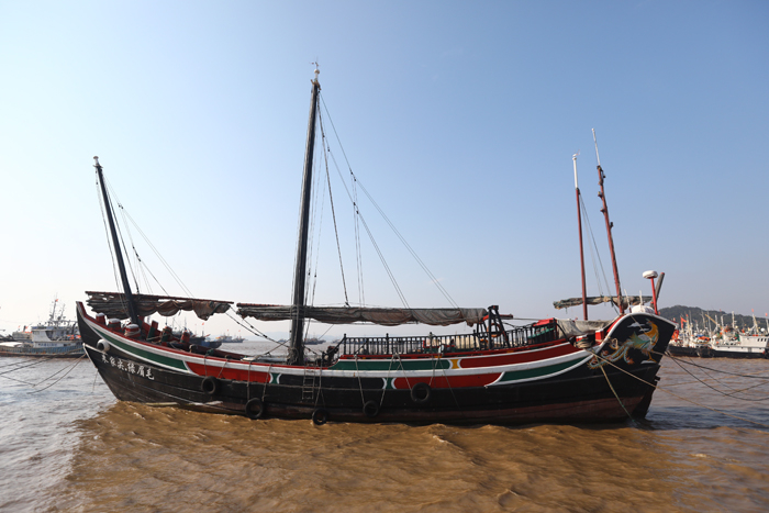 白天的绿眉毛号更显色彩鲜丽。这一浙江的古老船型,尖圆底,艏艉饰有民俗彩绘,船头如鸟,因舷前部龙眼上方一条绿色船眉而得名。它航速高,从上海吴淞口到舟山定海只顺风时仅需10小时左右。2002年岑国和复原的绿眉毛号是舟山乃至全国第一艘有航海能力和资质的仿古木帆船,也是他的第一件代表作品。之后,他又制作了仿清代安福舻号、仿唐代不肯去观音号、仿明代福船等大船。