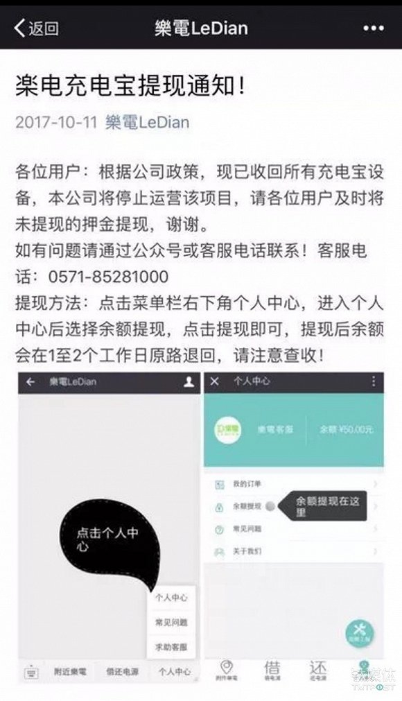 “根据公司政策,现已收回所有充电宝设备,本公司将停止运营该项目,请各位用户及时将未提现的押金提现,谢谢”,10月11日,乐电在其微信公众号上这样宣布。他们同时提醒,提现后余额会在1至2个工作日原路退回。对于部分用户提现失败的情况,乐电方面回应称,“服务器由于故障原因,有部分用户可能暂时无法提现,技术人员正在维护中。”