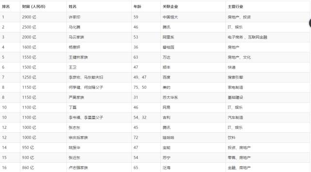 2.59岁的恒大许家印财富几乎是去年4倍,以2900亿元首次成为中国首富,他是胡润百富榜19年来第12位中国首富,也是历年来财富最高的首富。马化腾财富增长52%,53岁的马云及其家族财富缩水2%。胡润表示:“中国的首富和二富仍然分别来自地产和IT行业,只不过今年许家印代替了王健林,马化腾代替了马云。”