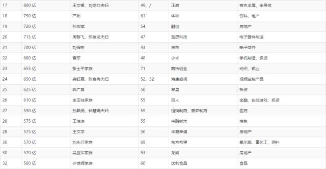 4.“黑马”:融创孙宏斌财富增长到去年的7倍多,以720亿排名第19;蚂蚁金服彭蕾财富增长到去年的4倍多,以400亿排名第48;今日头条34岁的张一鸣财富增长到去年的14倍多,以290亿排名第83;新上市的欧派家居姚良松以290亿排名第83。
