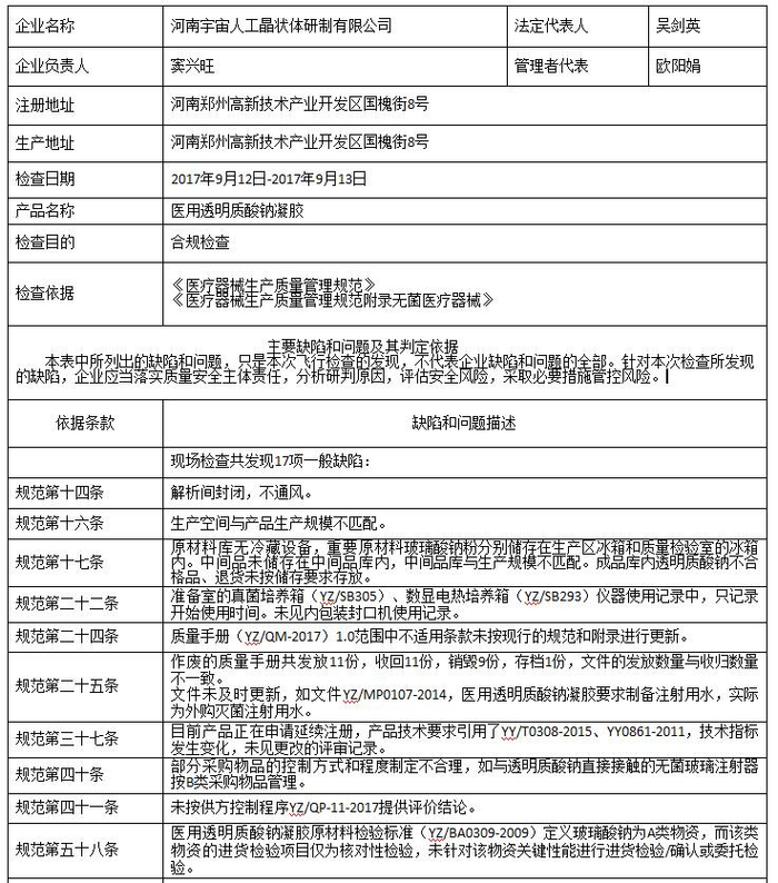 对河南宇宙人工晶状体研制有限公司飞行检查通报