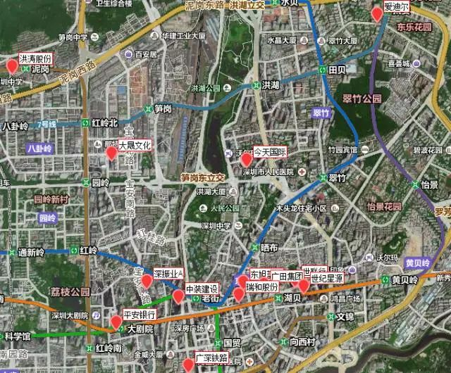 上图可以看到,仍然有不少公司名称重叠,其中车公庙附近分布有招商银行、盛迅达、农产品、飞马国际、中金岭南、太辰光、赫美集团及信立泰等。2号线华强北地铁站附近分布有深纺织A、中航地产、威华股份及深圳华强。