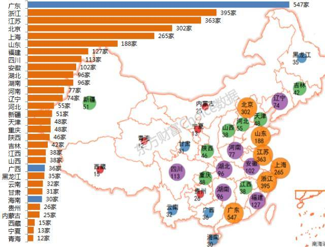 东方财富Choice数据近日发布了一个华南地区(广东、广西、海南)的上市公司地图,虽然只统计了A股,没有统计港股和美股,但仍然很有参考价值。