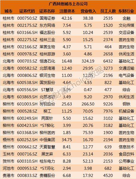 南宁市共计有上市公司13家。注册资本方面,位于青秀区民族大道126号的桂冠电力,以60.63亿元居当地上市公司注册资本之首;其后为广西广电,注册资本16.71亿元。营业收入方面,桂冠电力以85.65亿元居首;南宁糖业次之,2016年累计实现营业收入35.89亿元。此外,广西广电、皇氏集团、南宁百货及百洋股份四家公司2016年营收均在20亿元以上。
