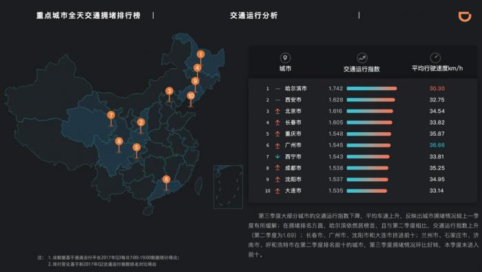 《报告》显示,第三季度哈尔滨再次成为全国拥堵最严重的城市,且与第二季度相比,交通运行指数上升。西安、北京、长春、重庆紧随其后。与上一季度相比,兰州、石家庄、济南和呼和浩特跌出前十。