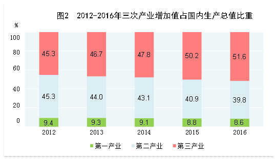 国家统计局数据显示,2015年,第三产业增加值占比首次突破50%,达到50.5%;2016年,第三产业在国民经济中的比重上升到51.6%,比第二产业高出11.8个百分点。