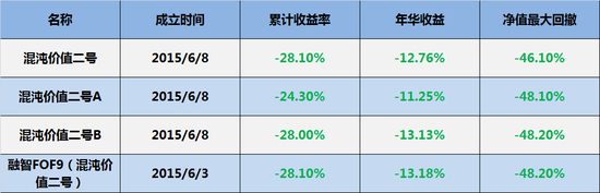 另外,混沌投资2015年成立的私募产品更让人大跌眼镜,“混沌价值二号”、“混沌价值二号A”、“混沌价值二号B”、“朝阳混沌专享基金一期”、“融智FOF9” 等产品收益损失惨重,在2016年底创业板大跌时,净值回撤超过40%,截止到现在依然全部亏损。